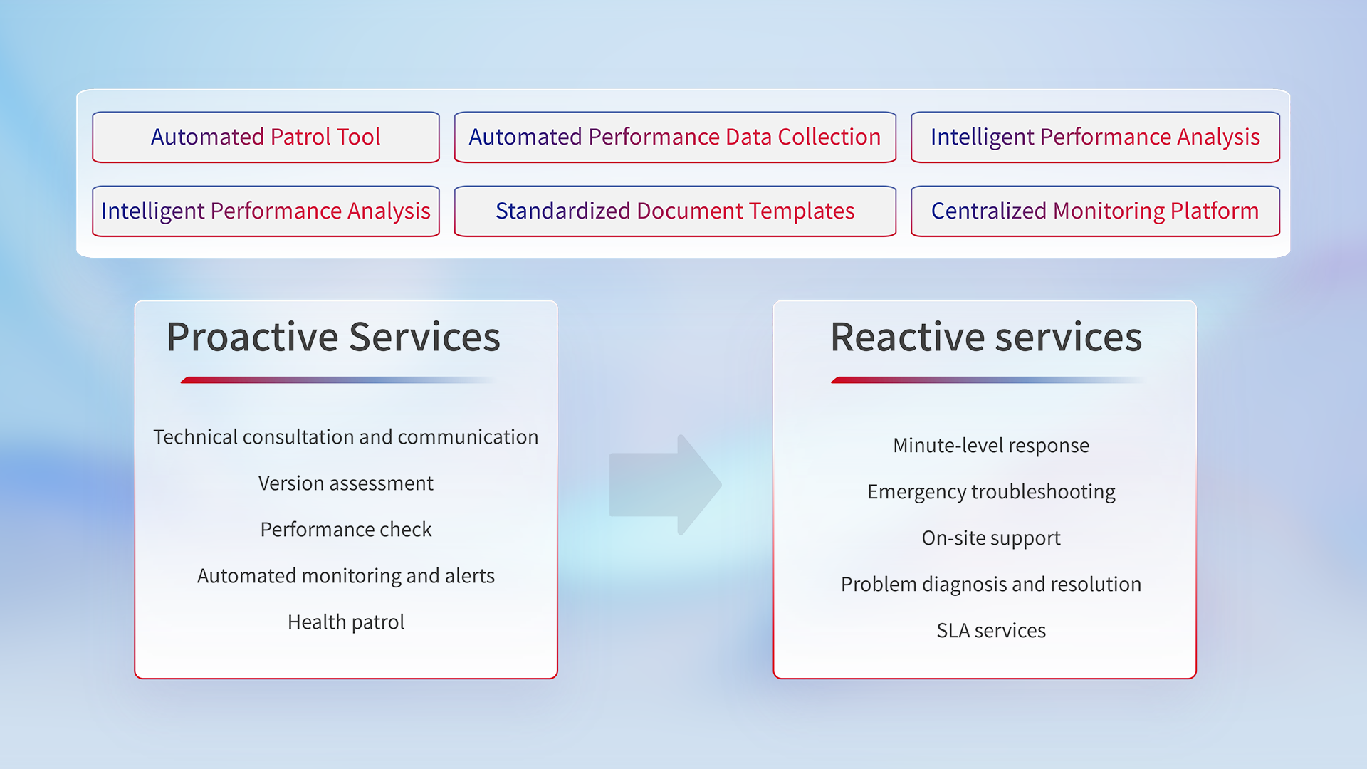 Intelligent tools and standardized documents to ensure service quality, providing proactive services (including technical consultation, version assessment, performance inspection, automated monitoring and alerts, health checks) and reactive services (including minute-level response, emergency troubleshooting, on-site support, problem diagnosis and resolution, SLA services).