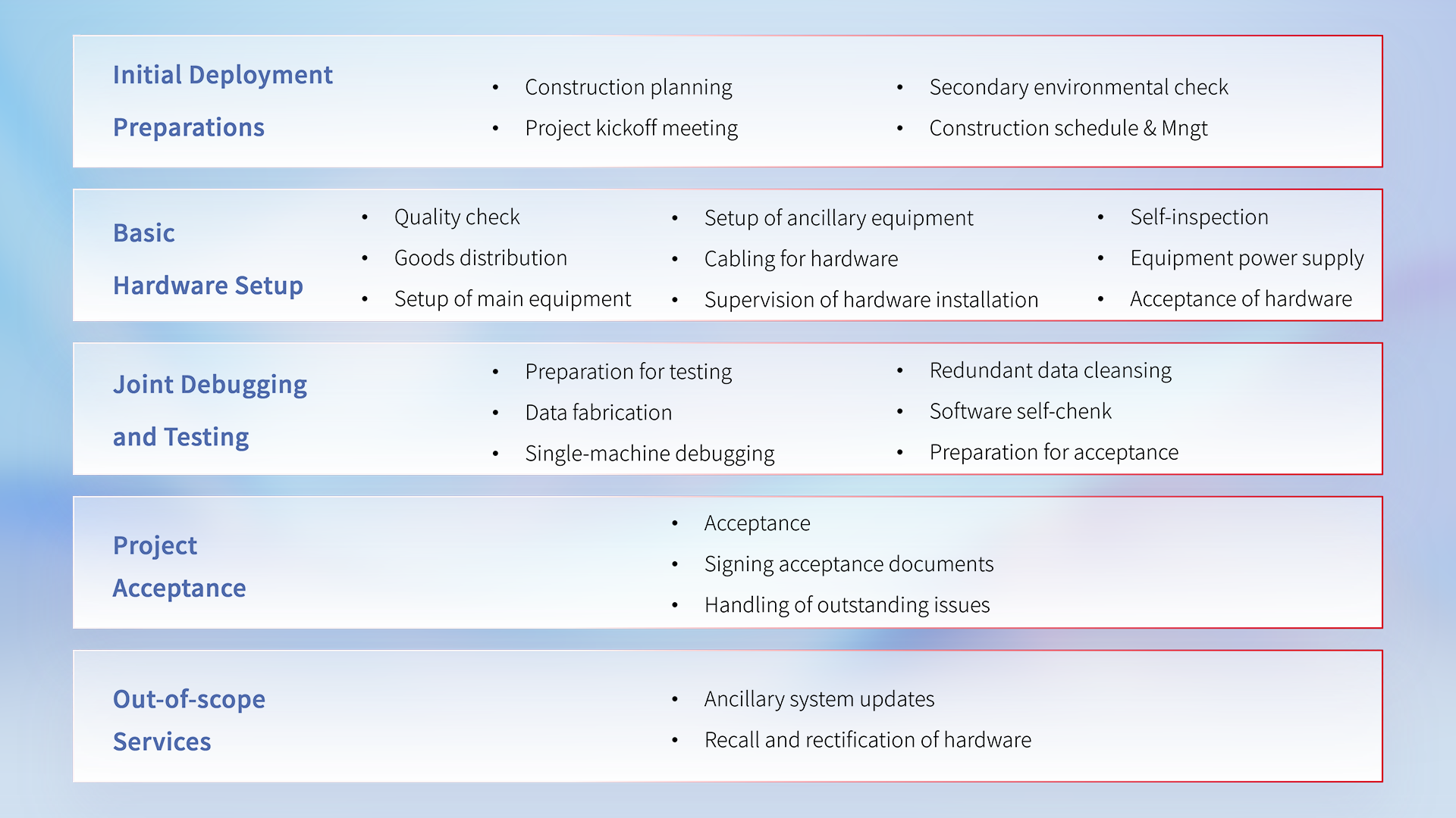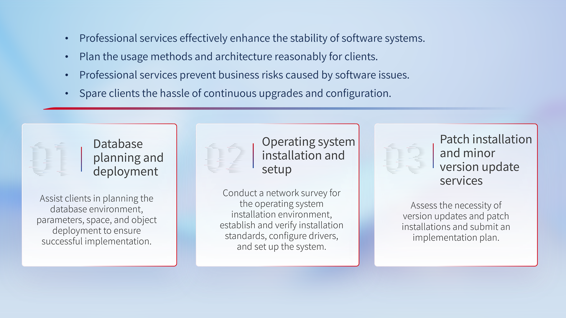 With our vision of customer business at the center and the safe and reliable operation of business systems as the goal, we provide daily maintenance of the customer's data center room's hardware and software equipment, and check the rationality of the maintenance strategies related to the design of the hardware and software systems. Ensure the customer's business systems are stable, secure, highly available, and enhance flexibility, scalability, and resource utilization.